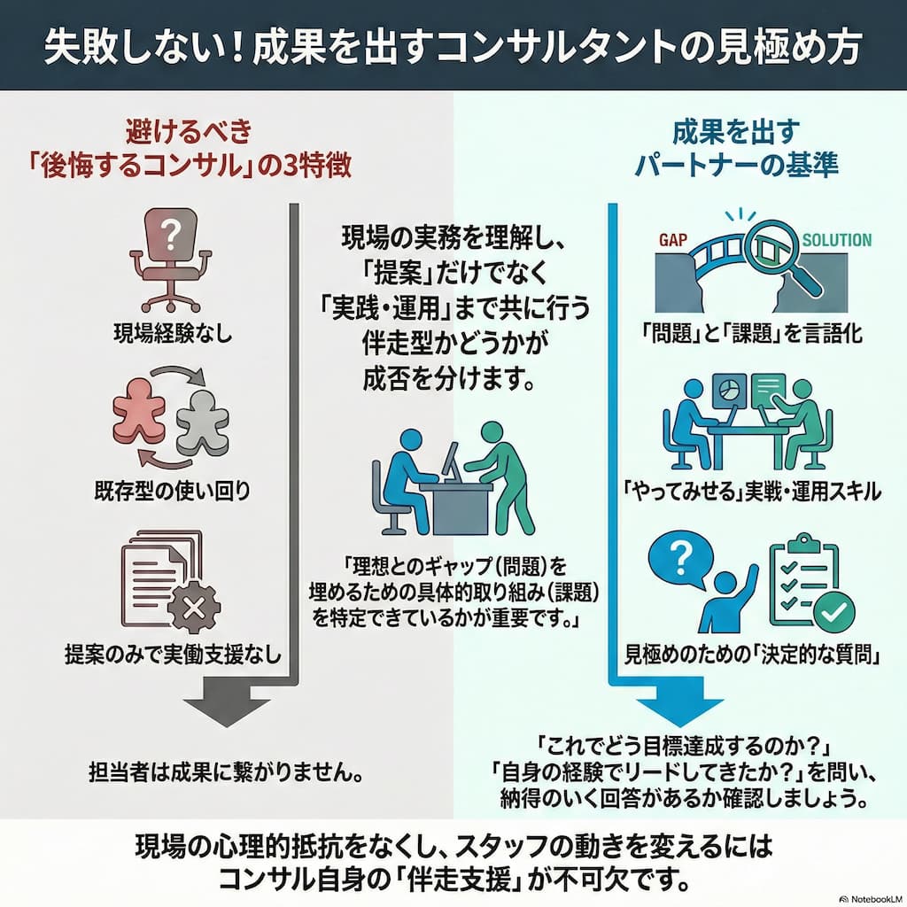 頼んで後悔するコンサルタントの共通点は、現場での実務経験不足、施策テンプレートの使い回し、実働支援の欠如です。良いコンサルを選ぶには、課題の見える化と明確化が重要。「それが目標達成にどう役立つのか」を質問し、納得のいく回答を得られるかで判断できます。最適解は実践・運用が伴う併走支援スタイルのコンサルタントです。